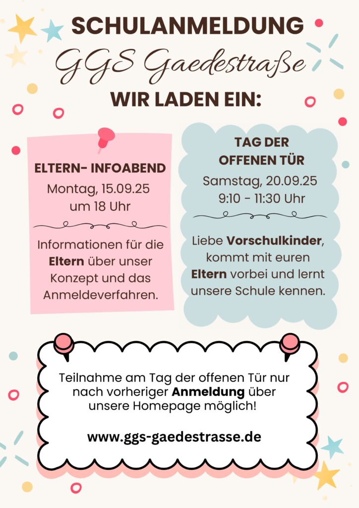 HERZLICH WILLKOMMEN auf der Homepage der GGS Gaedestraße Termin zur Schulanmeldung Einschulung 2025 Bei der Einschulungsfeier am 28.8. wurden die neuen Erstklässlerinnen und Erstklässler in der GGS Gaedestraße herzlich begrüßt. weiterlesen Danke, Leybold! Seit diesem Schuljahr besteht eine Kooperation zwischen unserem Nachbarunternehmen Leybold und der GGS Gaedestraße. weiterlesen