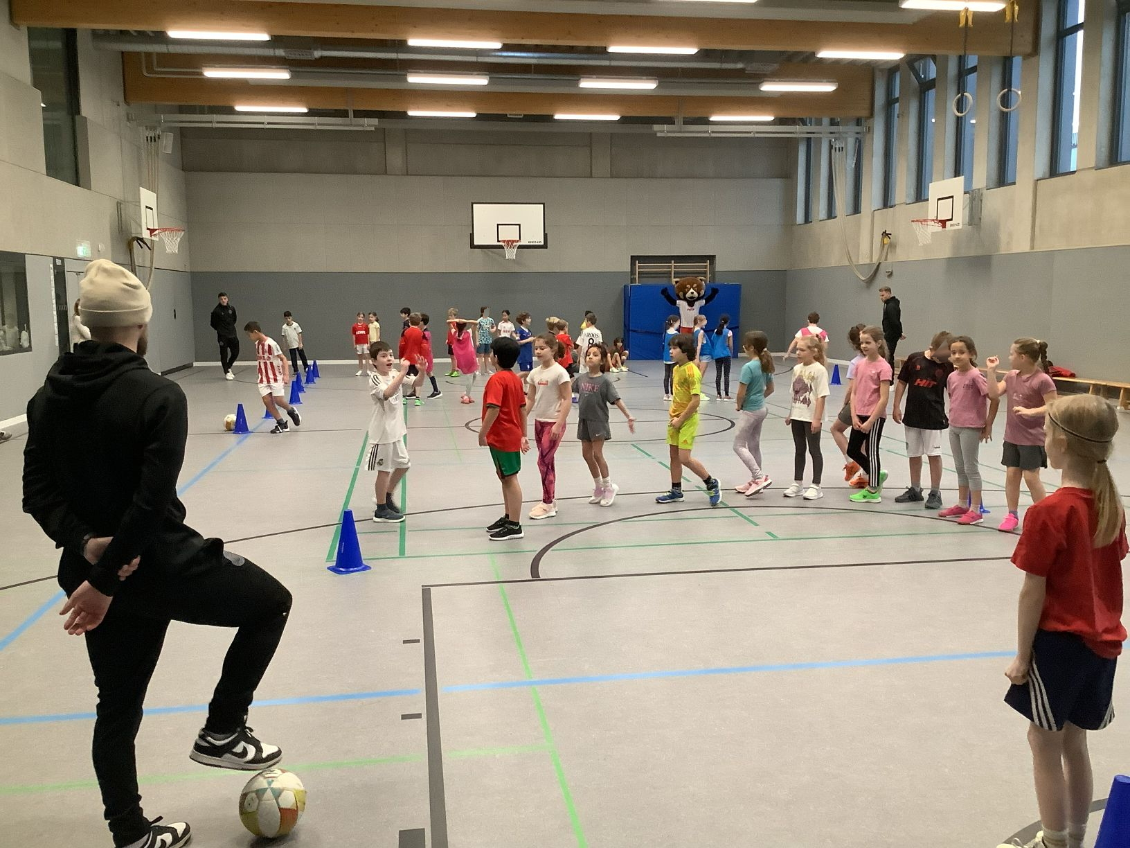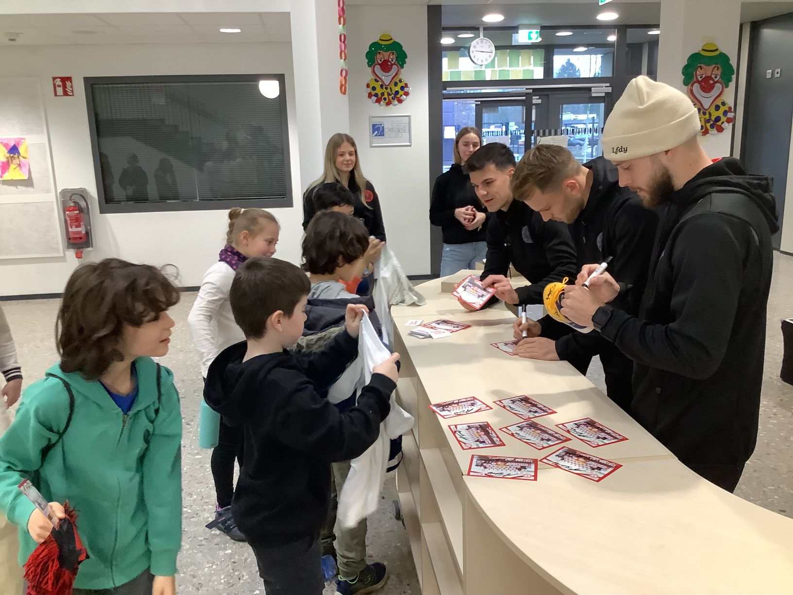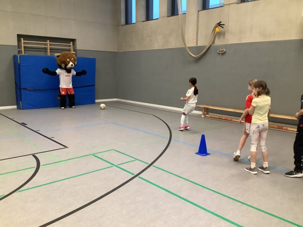 Kurz vor Karneval gab es noch eine besondere sportliche Aktion in unserer Schule. Drei Profifußballer vom SC Fortuna Köln sowie das Maskottchen Fred haben die Gaedestraße besucht. Die Kinder des grünen Clusters durften gemeinsam mit den Fußballern einige Trainingsstationen in der Turnhalle erproben. Außerdem konnten die Kinder noch viele Fragen an die Fußballer stellen. Zum Abschluss durften alle Kinder der Schule sich eine Autogrammkarte sichern.