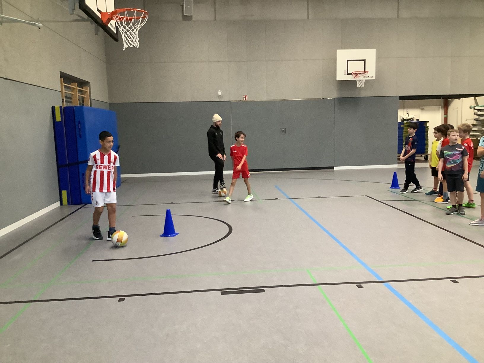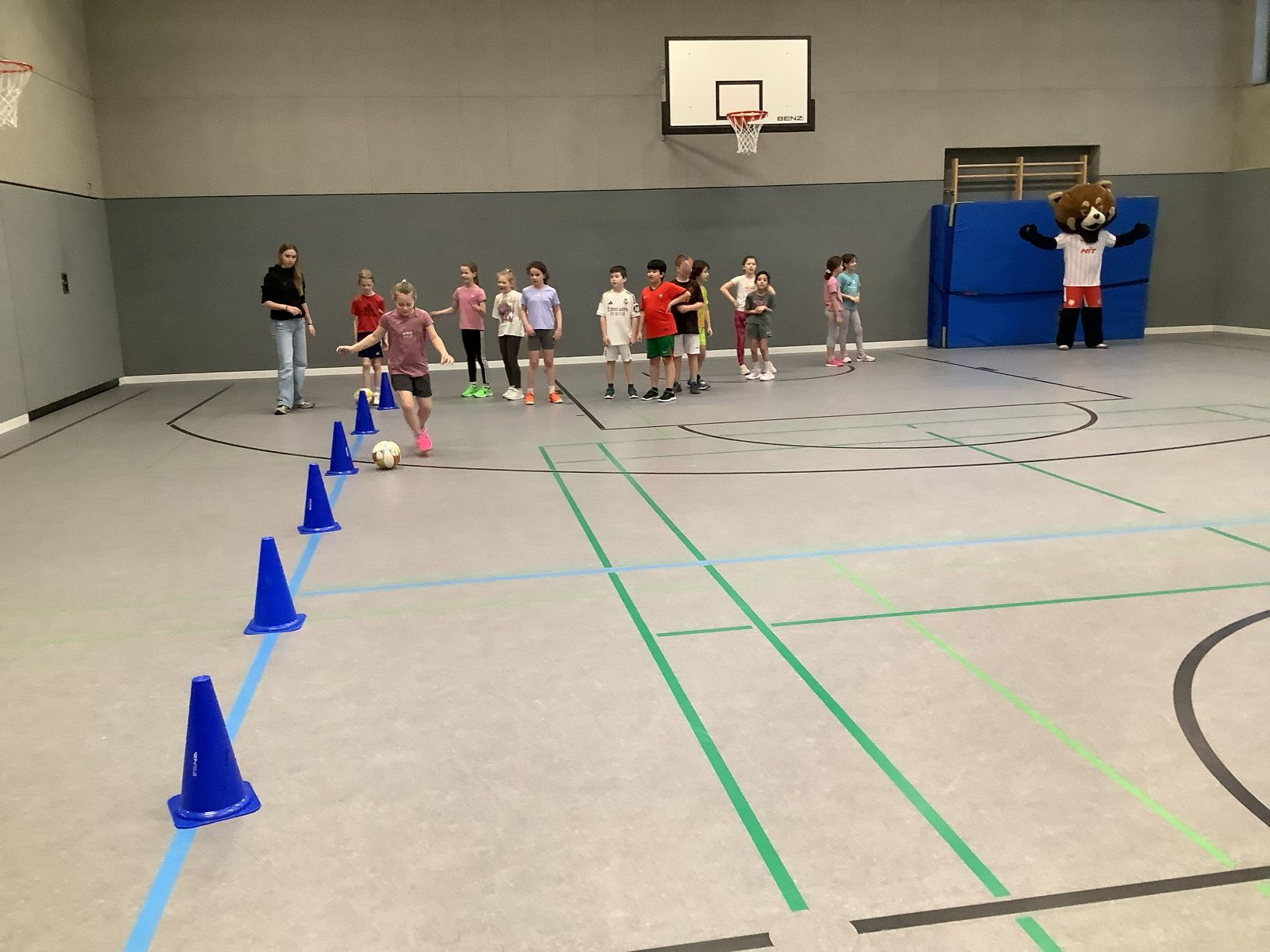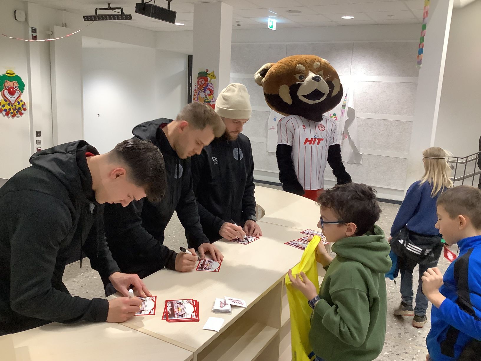 Kurz vor Karneval gab es noch eine besondere sportliche Aktion in unserer Schule. Drei Profifußballer vom SC Fortuna Köln sowie das Maskottchen Fred haben die Gaedestraße besucht. Die Kinder des grünen Clusters durften gemeinsam mit den Fußballern einige Trainingsstationen in der Turnhalle erproben. Außerdem konnten die Kinder noch viele Fragen an die Fußballer stellen. Zum Abschluss durften alle Kinder der Schule sich eine Autogrammkarte sichern.