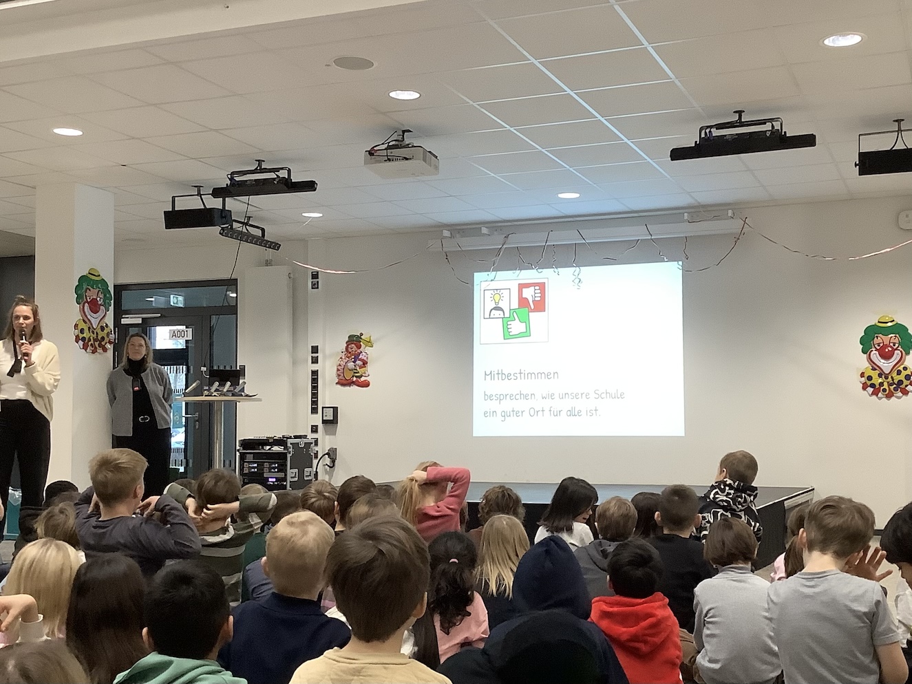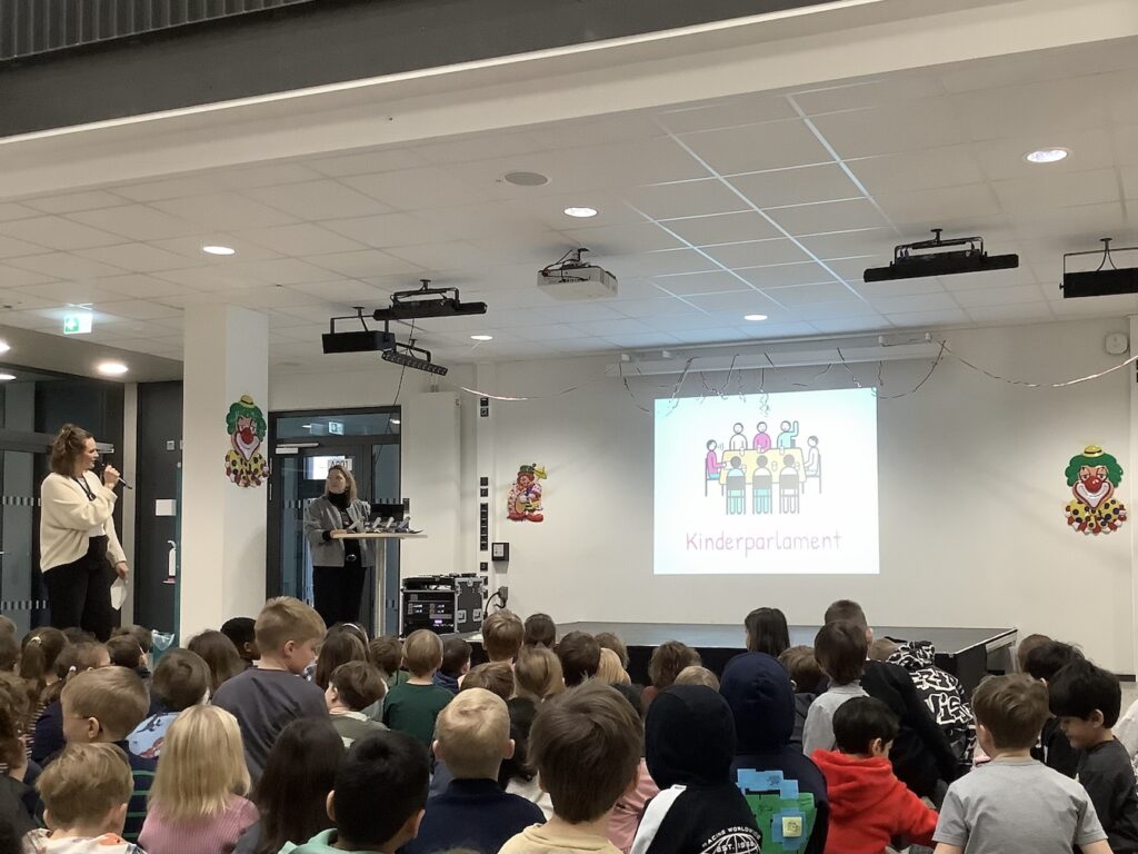 Am Freitag, den 16. Januar haben sich alle Kinder und Erwachsenen unser Schule in der Aula zu unserer allerersten Schulversammlung getroffen. Hier haben wir gemeinsam erforscht, wie wir mitbestimmen können und dass es wichtig ist, dass alle Meinungen gehört werden. Deshalb wird an unserer Schule ein Kinderparlament gegründet. Außerdem haben wir beschlossen, dass wir gemeinsam eine Lösung dafür finden möchten, dass sich jedes Kind auf den Toiletten wohlfühlen kann.