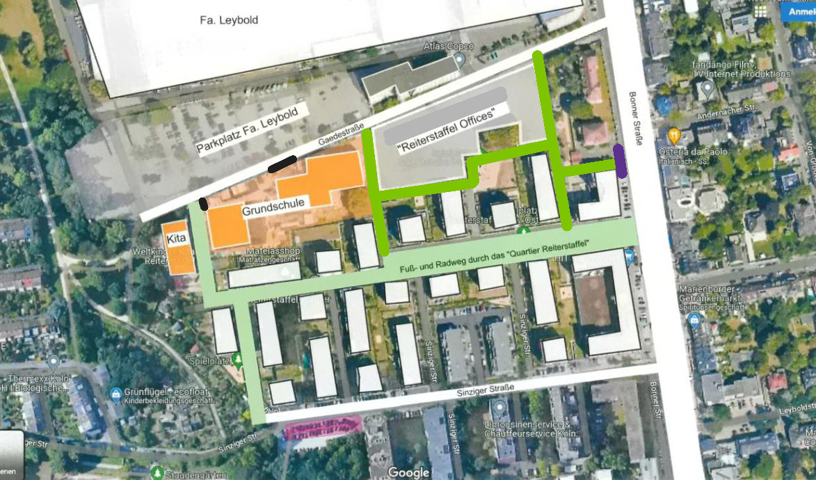 Die Kinder können die Schule auch von der anderen Seite gut erreichen. Zum einen wäre es möglich die Kinder, welche mit dem Auto gebracht werden müssen, an der Bonner Straße rechts vom Hit rauszulassen oder ein zweiter Weg wäre über die Sinziger Straße. Am Ende der Straße befindet sich ein großer Parkplatz, an dem die Kinder, rausgelassen werden können. Von beiden Punkten ist es ein kurzer und sicherer Schulweg, durch das autofreie Reiterstaffelquartier. Gegenüber der Kita befindet sich ein 2. kleines Schultor, welches am Morgen und Nachmittag geöffnet wird und so von den Kindern genutzt werden kann.